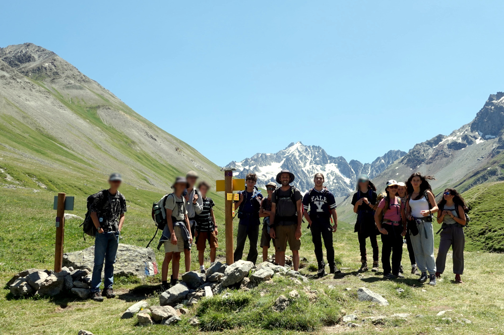 Notre aventure au pays des glaciers a commencé dans le Trièves dans la montée du Pas du Serpaton à deux pas de la station de ski de Gresse-en-Vercors. Il s’agit d’une journée d’entraînement, afin que jeunes et adultes puissent s’apprivoiser (nous compris) en douceur avant d’être plongés au plus près des glaciers. Certains se connaissent déjà pour s’être cotoyés lors des différentes sessions de Tribus du Futur. D’autres se découvrent, entre timidité et curiosité. Cette première journée est l’occasion de toucher du doigt les problématiques de transition en montagne, notamment par rapport à celles de la station de ski de Gresse-en-Vercors. Ce premier jour sera en fait l’étape avec quasiment le plus de dénivelé par rapport aux trois autres jours au sein du massif des Ecrins. En tout cas, le groupe semble suffisamment en forme pour aller sur le glacier à 3400 m d’altitude.