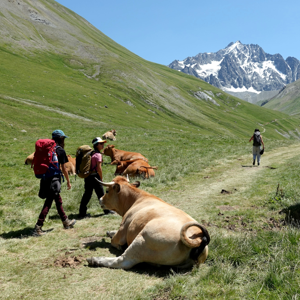 Une fois sur l’alpage, il nous faut traverser au milieu des habitants permanents estivaux de l’alpage, à savoir les marmottes et les troupeaux de vaches. Tout se passe sans encombre, même si ces animaux de plus de 500 kilos sont très impressionnants. Dans notre direction de progression, vers le sud, nous apercevons la montagne des Agneaux, sommet emblématique des Ecrins. Sur la droite, c’est le groupe de la Grande Ruine, qui culmine à 3765 m d’altitude. Toute la vallée en contrebas ressemble à une auge, indication qu’elle a été creusée par un glacier qui était présent il y a plus de 20 000 ans lors de la dernière période glaciaire.