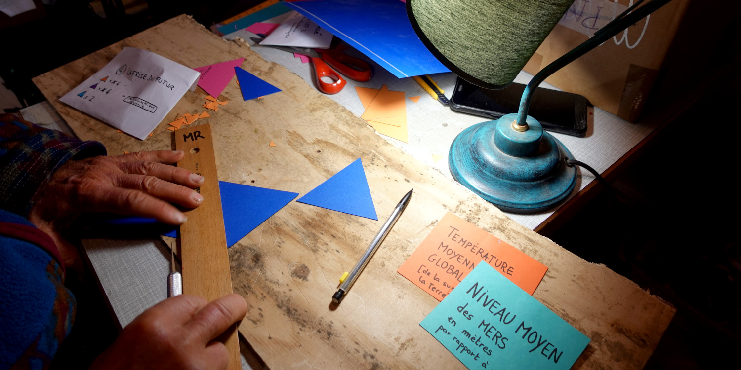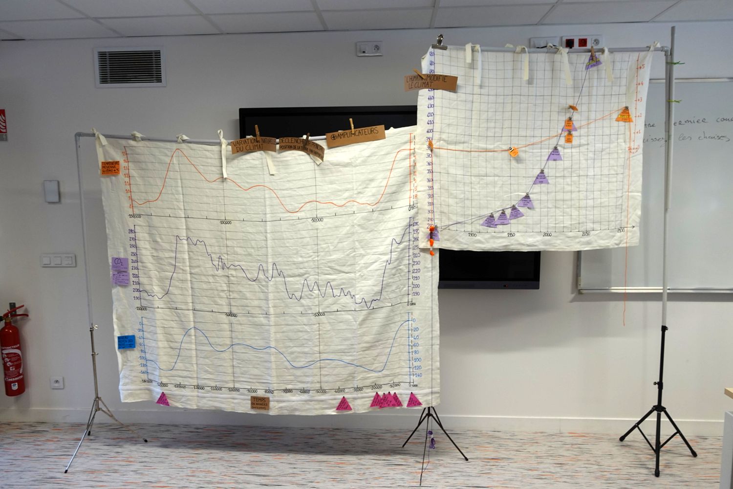 Chez les 3ème, qui à présent ont également suivi les ateliers pré-cités, la thématique est portée sur l’empreinte carbone, les récits futurs, et depuis cette année, la Frise des GlaGlaciations qui prend du recul sur les évolutions climatiques du passé, du présent et du futur.